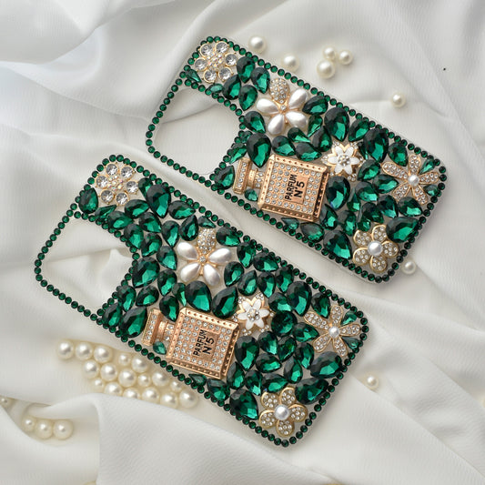 Green Crystal Encrusted Full Wrap Silicone iPhone case with Perfume bottle - iPhone 13 Pro/ 13 Pro Max