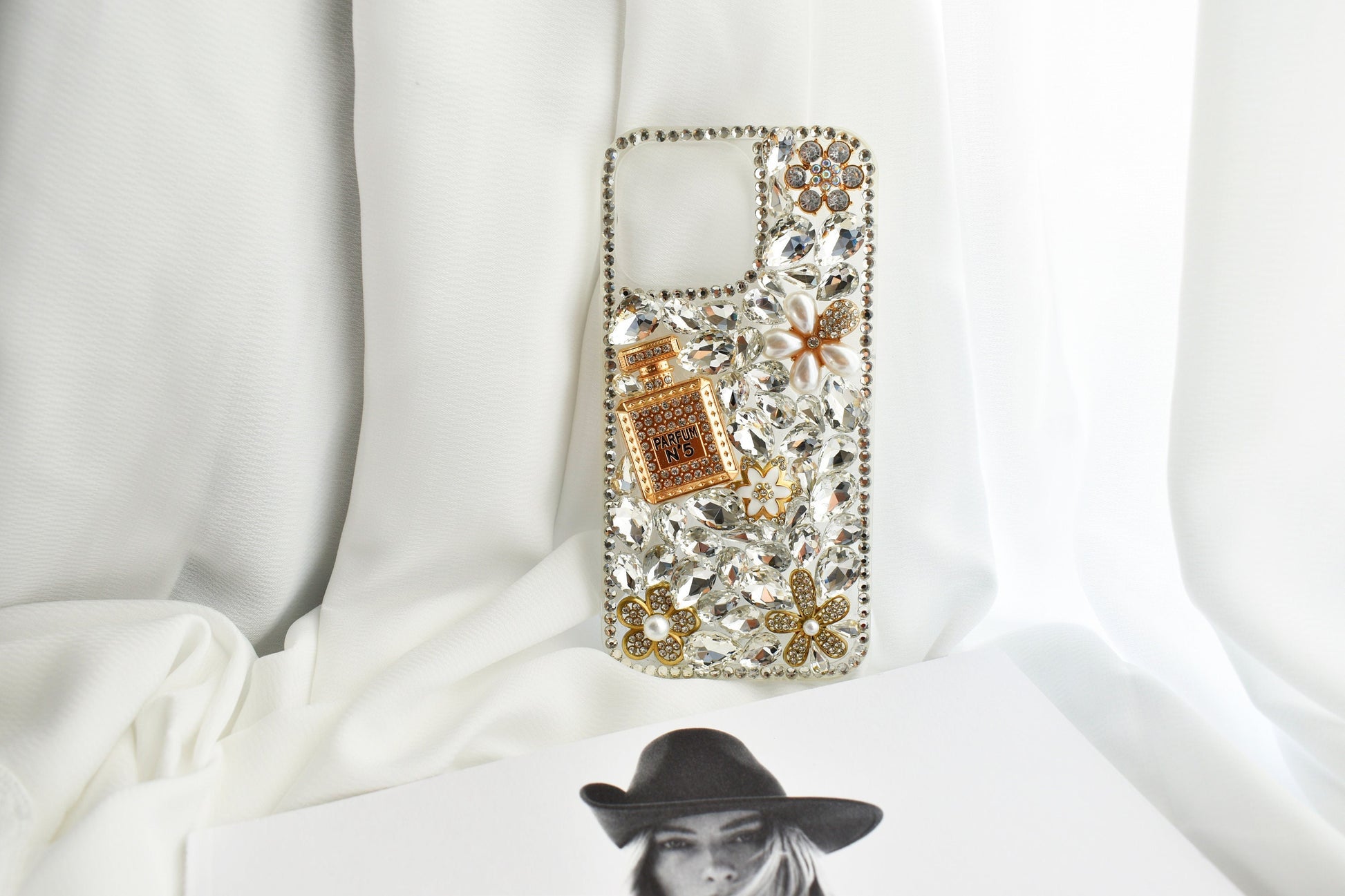 Pearl Diamond Encrusted Full Wrap Silicone White iPhone case with Perfume bottle - iPhone 14/13