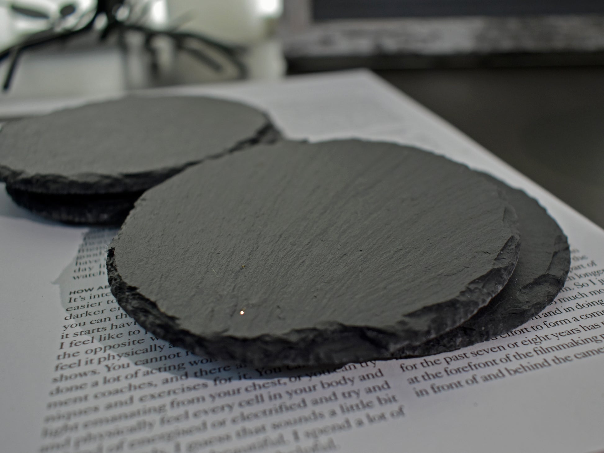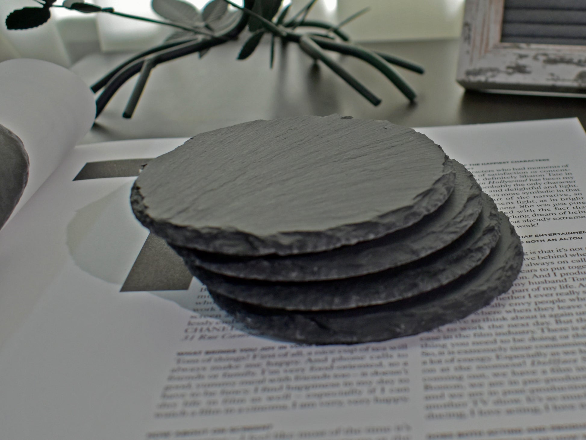 These are high quality slate, with rubber feet on the back to give them a slip free placement.